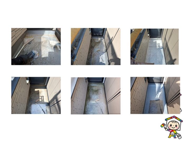 施工前は非常に苔やカビなども多数ありました、高圧洗浄を丁寧に施工して表面の苔やカビを落としています。付着性向上にも非常に重要な工程です。